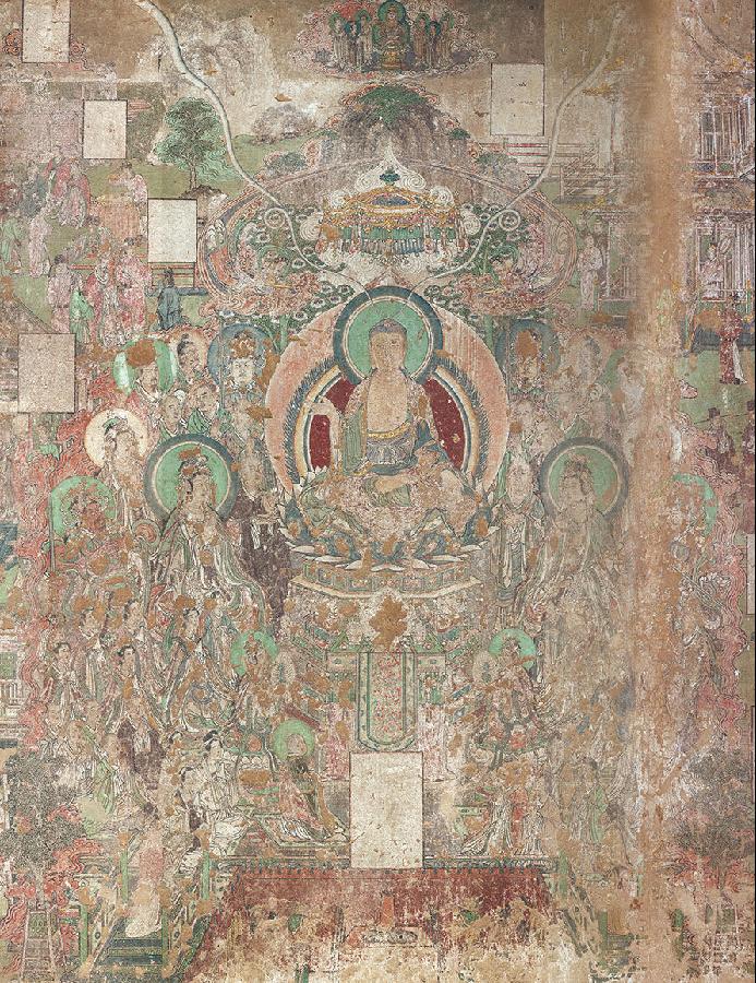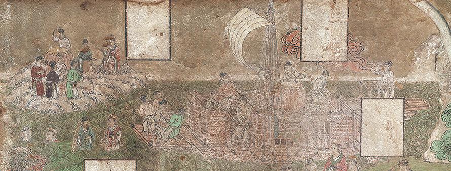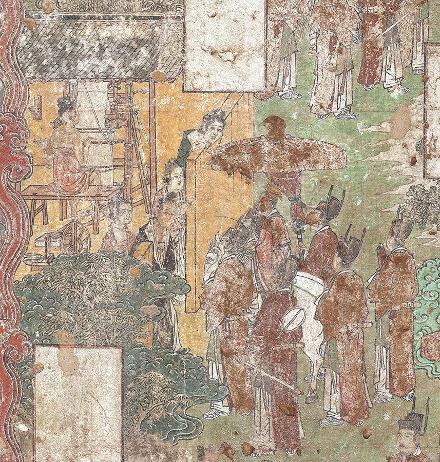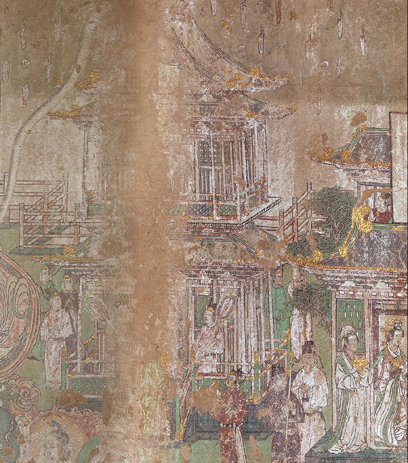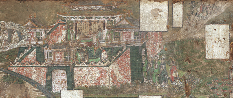 西壁壁画中最经典的内容,莫过于善友太子本生故事,该部分图像面积最大,场景最为恢弘。完整地描绘了释迦前生善友太子由出生到观四事,继而怀怜悯众生之心,历尽磨难取得摩尼宝珠为众生祈福的故事。