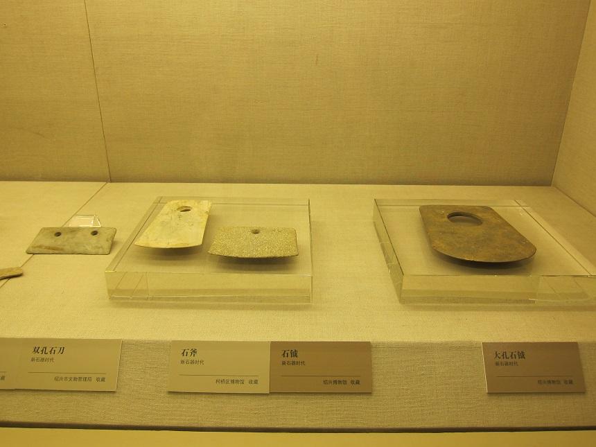“工欲善其事,必先利其器”,工具在劳动生产中的作用是不言而喻的,古代农业耕作技术的进步很大程度上是建立在耕作工具的发展之上。大约在距今六、七千年前后,於越先民已经掌握了锄耕或耜耕的方法,展柜当中的这些石质工具,表明人们已经开始懂得播种前要先翻土地,能使土质疏松,改良土壤的结构,延长土地的使用年限。这件石质破土器,是当时农业生产方式进步的重要标志,而石犁的出现,代表农业生产已经进入到了“犁耕时代”。